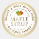 Simple and Elegant Round White Maple Syrup Label with the words "Maple Syrup" in a metallic gold text. Business name and location in embossed text. Dashed line border in gold. Editable form field for Grade of Maple Syrup and net weight. Three colourful sugar maple leaves. Delicate gold border on circular label. Gold metallic rounded corner background on square label.