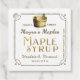 Dotted border with ornate frame with a vintage sap bucket and words "MAPLE SYRUP" printed in a metallic gold gradient. Product information and contact info on back of label.