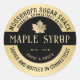 Personalise this maple syrup label with the business name, location, grade, and volume (list included of US and metric conversions for popular sizes). Central metallic gold maple leaf in black circle. State name in curved text near bottom of label. Pale gold gradient background.