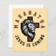 Maranatha Jesus is coming, this Christian design features a male lion head with a cross and text saying, "Maranatha, Jesus is coming".