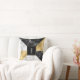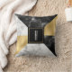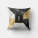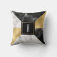 Modern monogrammed accent throw pillow done in a geometric pattern of gold tone foil, white marble and black marble. A black and gold square, in the middle of the pillow has a white single letter monogram ready to personalise. Lovely home decor and makes a great gift idea.