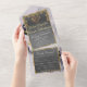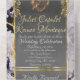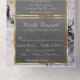 This elegant All In One wedding invitation features a dark grey center on a black and white marble background, framed with gold roses and leaves, embellished with a gold scroll heart. Designed to coordinate with the "Elegant Marble, Gold Leaves Frame & Scroll Heart" Wedding Collection. To change details, click «Personalize». To move the text or change the text size, font, or color click «Click to customize further»