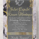 This elegant All In One wedding invitation features a dark grey center on a black and white marble background, framed with gold roses and leaves, embellished with a silver scroll heart. Designed to coordinate with the "Elegant Marble, Gold Leaves Frame & Scroll Heart" Wedding Collection. To change details, click «Personalize». To move the text or change the text size, font, or color click «Click to customize further»