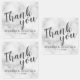 featuring title "Thank You" in grey modern script font with name and date in modern sans serif font on white marble background.