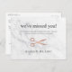Announce the grand reopening of your business with these modern and elegant postcards for hair salons and styling studios. Design features modern charcoal lettering on a white marble background accented with a pair of stylist's scissors in faux rose gold foil. Personalise the front and back with your business reopening details, including location and hours, and what covid related measures you have implemented to keep customers, clients, and staff safe.