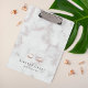 Chic personalised clipboard for your makeup artist or aesthetician business features two lines of custom text in charcoal grey lettering, on a marble background adorned with a pair of lush lashes and brows in faux rose gold foil. Design repeats on reverse side.