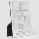Elegant plaque with easel displays your salon services or price list in charcoal grey lettering on a marble background adorned with a scissors logo in faux rose gold foil. Includes three customisable headings and body text fields. To adjust layout, enter your text and then use the Customise function to change positioning and font sizes.