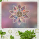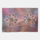A pale but colourful fractal design like star clouds in outer space or multi-coloured marble with shades of pink, mauve, peach, and blue. The background is a mottled texture like a distant nebula, and the piece is accented by a gold-framed starburst medallion as if inlaid with gold filigree. Completing the picture are smooth opal-like jewels and faceted gemstones inset in a golden floret.