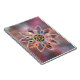 A pale but colourful fractal design like star clouds in outer space or multi-coloured marble with shades of pink, mauve, peach, and blue. The background is a mottled texture like a distant nebula, and the piece is accented by a gold-framed starburst medallion as if inlaid with gold filigree. Completing the picture are smooth opal-like jewels and faceted gemstones inset in a golden floret.