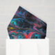 Marbled poured paint abstract pattern in bright shades of bright cyan blue, red-orange, hot pink, school bus yellow on black.