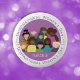 A purple and white pin button to help you celebrate International Women's Day on March 8th .