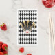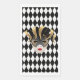 This paper guest napkin is shown in a festive black and white harlequin diamonds print with a Mardi Gras mask print.