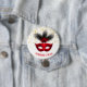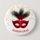 This round button pin is shown with a festive Mardi Gras mask print design.