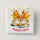 This square button pin is shown with a festive Mardi Gras mask print design.