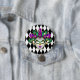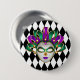 This round button pin is shown with a festive Mardi Gras mask print design.