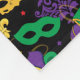 Colourful Mardi Gras patterned blanket with carnival face masks, fleur de lys motifs and jester masks in purple, green and gold on black