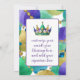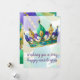 Tilted mardi gras crown sitting in front of mardi gras beads on this fully customizable mardi gras greeting card. The reverse of the card has room to customize your message and add your signature line.