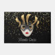 This doormat is shown with a Black coloured background with gold stars with a festive carnival Mardi Gras Mask print.