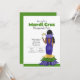 Mardi Gras Gal holding a masquerade mask on her left hand. Dark skin female wearing a purple dress with purple, green, and yellow raffles. She also has purple feathers on the collar of her dress. Cute festive Mardi Gras fashion illustration masquerade party invitation. Invite family and friends to your carnival or parade masquerade party.