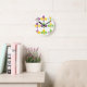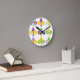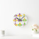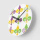This wall clock has a Mardi Gras design of fleur de lis lined across the design with different design in them.