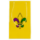 Design with seamless pattern with fleur-de-lys (lilly flowers) in the colours of New Orleans Mardi Gras; purple, golden and green design on yellow background