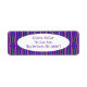 These return address labels have a geometric Mardi Gras design of sort of flat-ended ovals repeating across the design in gold and green on a field of purple.