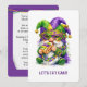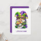A whimsical gnome, adorned in a vibrant Mardi Gras mask and jester hat, happily enjoys a slice of king cake while sporting colorful beads.