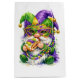 A whimsical gnome, adorned in a vibrant Mardi Gras mask and jester hat, happily enjoys a slice of king cake while sporting colorful beads