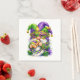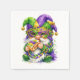 A whimsical gnome, adorned in a vibrant Mardi Gras mask and jester hat, happily enjoys a slice of king cake while sporting colorful beads