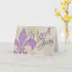 These Mardi Gras cards feature an artsy design of a purple Fleur de Lis on a watercolor style purple, green and gold background. The front of the card reads MARDI GRAS in a swirly, over sized font. Add your personal message to the inside of the card, or delete the card and keep a few on hand for any occasion!