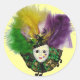 Design features a mask decorated with a Mardi Gras Indian motif.