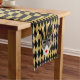 This table runner is shown with a black and gold diamond pattern background print with a festive Mardi Gras festival mask print design.