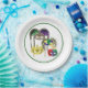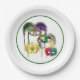 Set of eight 9” paper plates with an image of four colourful Mardi Gras masks adorned with bright feathers, sequins and glitter on white with a green border. See matching candy jar, espresso cup, flask, mug, pitcher, shot glass, teapot and coasters. See the entire Mardi Gras Plate collection in the FOOD/BEV | Dishes section.