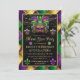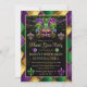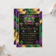 Elegant Gold, Purple and Green Mardi Gras Masquerade design with carnival mask, bokeh lights and diamonds with an abstract background.