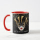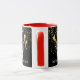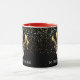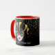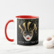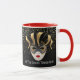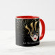 This combo red and white mug has an image of a Mardi Gras masks over petite golden-colour stars on a black background. Text of "Let the good times roll' is beneath the mask on Each side of the mug. Customise this item or buy as designed. Colours: red handle and interior, black background, golden stars and a gold-coloured and black masks.