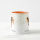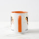 This combo orange and white mug has an image of a Mardi Gras masks over petite golden-colour stars on a white background. Text of "Let the good times roll' is beneath the mask on Each side of the mug. Customise this item or buy as designed. Colours: orange handle and interior, white background, golden stars and a golden-orange and black coloured masks.