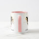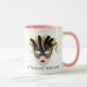 This combo rose pink and white mug has an image of a Mardi Gras masks over petite golden-colour stars on a white background. Text of "Let the good times roll' is beneath the mask on Each side of the mug. Customise this item or buy as designed. Colours: pink handle and interior, white background, golden stars and a gold-coloured and black masks.