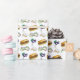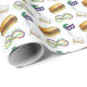 Wrapping paper features an original marker illustration of four classic Mardi Gras designs: beignet, shrimp po'boy sandwich, beads, and a mask. Great for Mardi Gras celebrations!