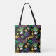 Mardi gras carnival tote bag patterned with carnival face masks, fleur de lis motifs and jester masks in purple, green and gold on black