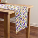 This table runner is shown with a festive Mardi Gras colors mask pattern print.