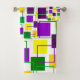 This towel set has a geometric design of squares in purple, yellow, and green scattered about with their outlines.