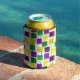 This can cooler has a geometric design of squares in purple, yellow, and green scattered about with their outlines.