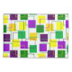 This pillowcase has a geometric design of squares in purple, yellow, and green scattered about with their outlines.