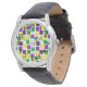 This men's watch has a geometric design of squares in purple, yellow, and green scattered about with their outlines.