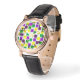 This women's watch has a geometric design of squares in purple, yellow, and green scattered about with their outlines.