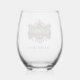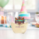 This wine glass is shown in a festive Mardi Gras bourbon street print.