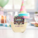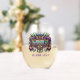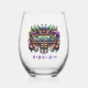 This wine glass is shown in a festive Mardi Gras bourbon street print.