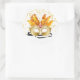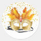This large size round sticker is shown in a festive Mardi Gras celebration mask print design.