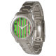 This women's watch has a simple Mardi Gras design of vertical stripes in yellow, green, and purple.
