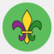Design with seamless pattern with fleur-de-lys (lilly flowers) in the colours of New Orleans Mardi Gras; purple, golden and green design on green background